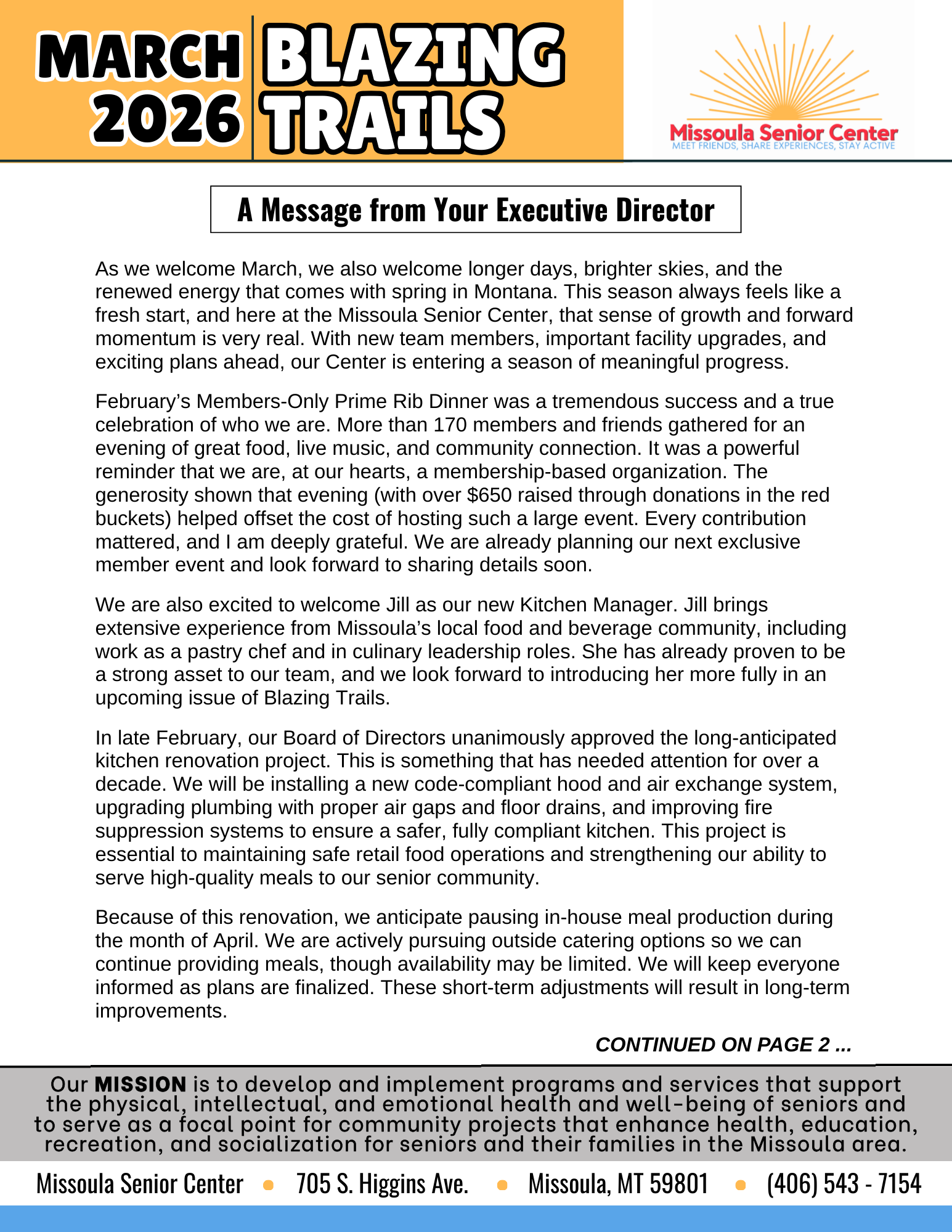 is to develop and implement programs and services that support the physical, intellectual, and emotional health and well-being of seniors and to serve as a focal point for community projects that enhance health, education, recreation, and socialization for seniors and their families in the Missoula area.