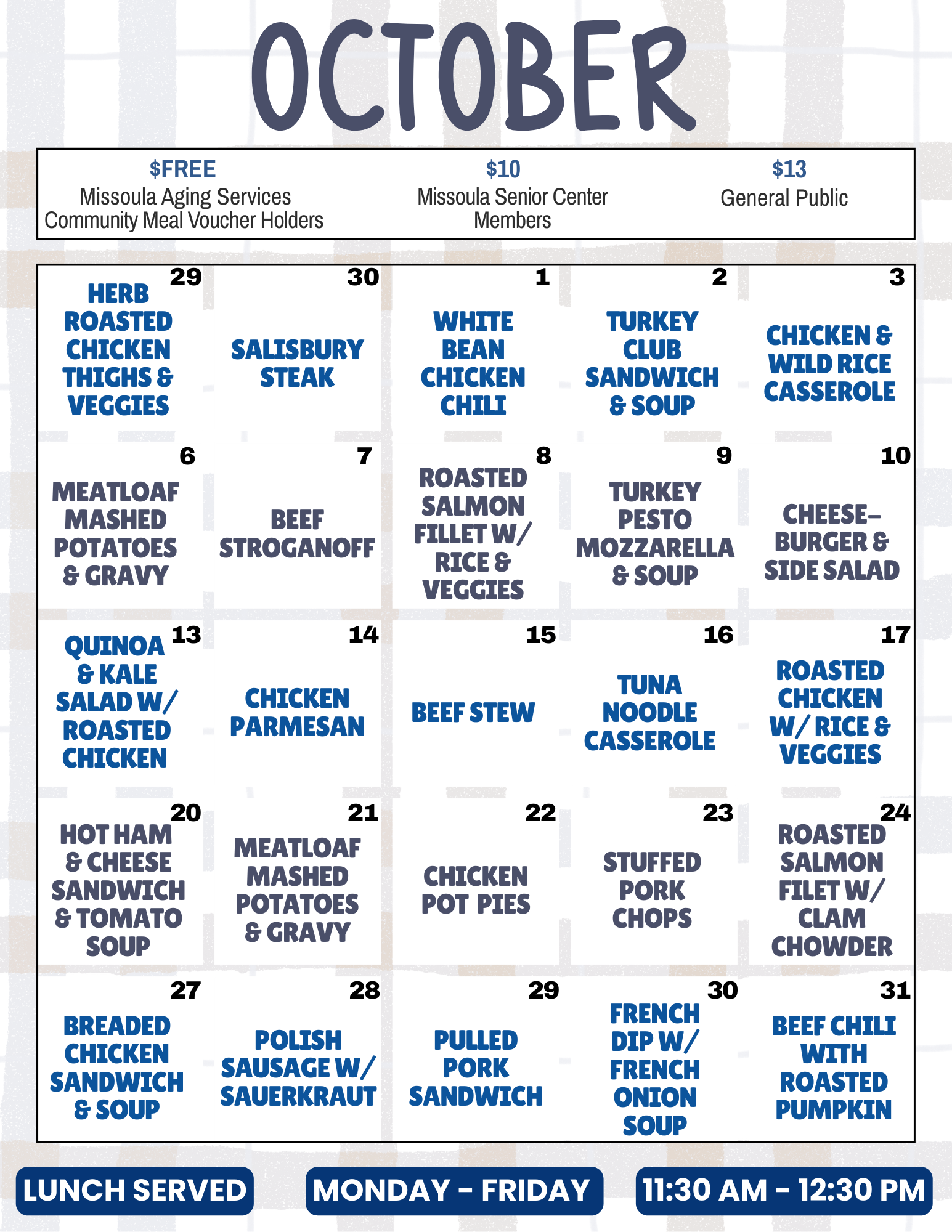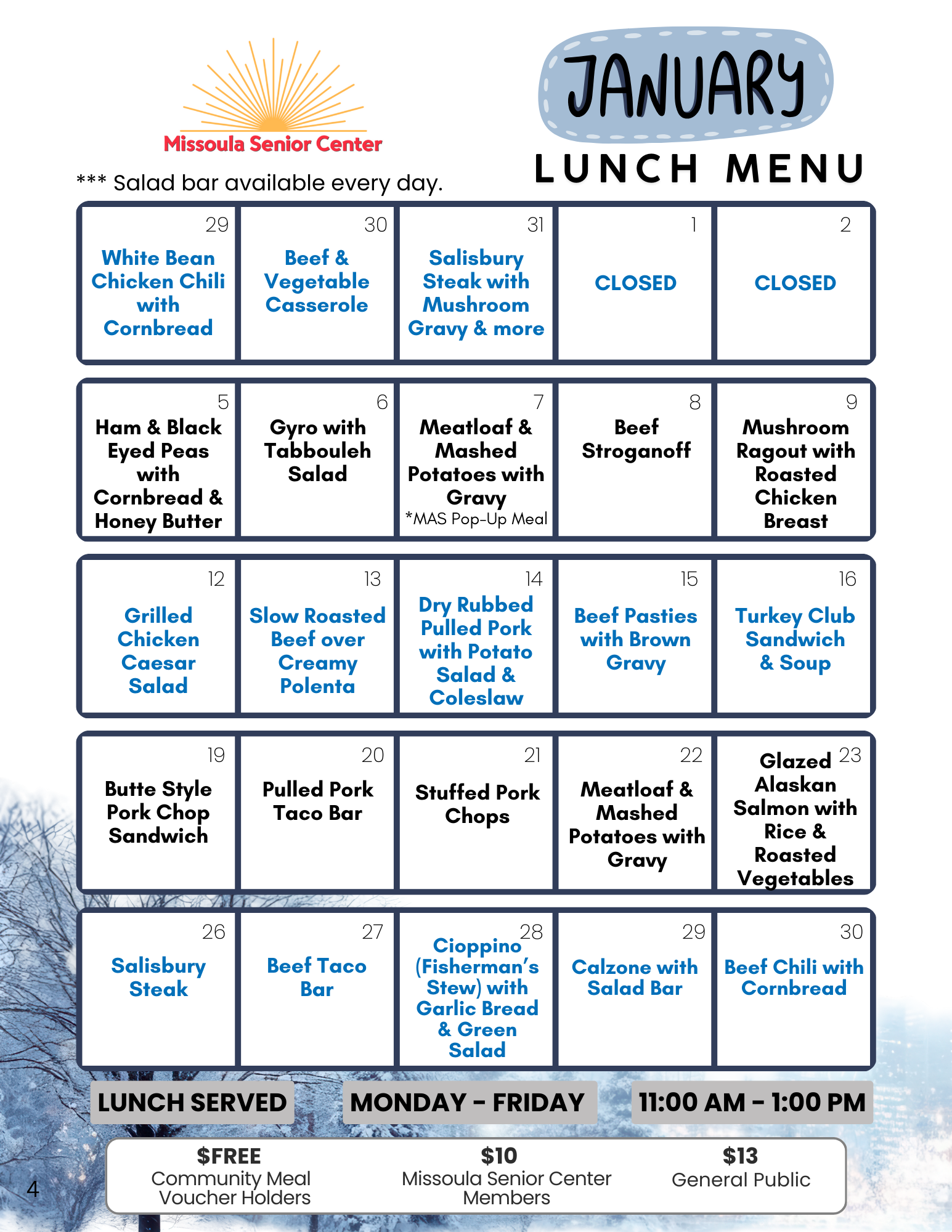 Welcome to Lunch at MSC Hours of Operation 11:30 am to 12:30 pm COST $10 Missoula Senior Center Members $10 $13 General Public $13 $0 Congregate Meal Voucher Holders - $0 Please contact Missoula Aging Services to receive your meal vouchers.